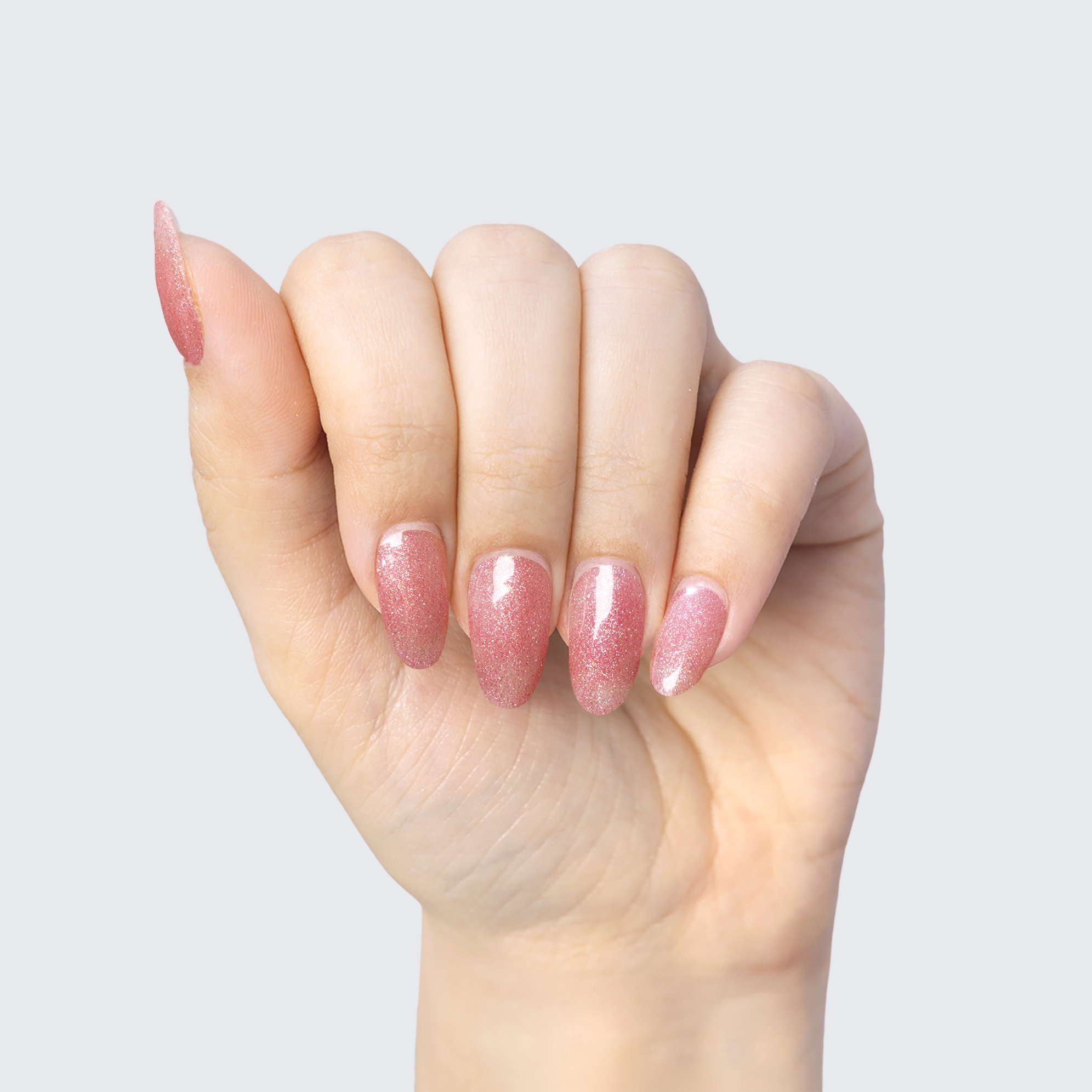 Dusty pink with faint white spots. Pink & silver shimmer. Semi transparent. Warm undertone.